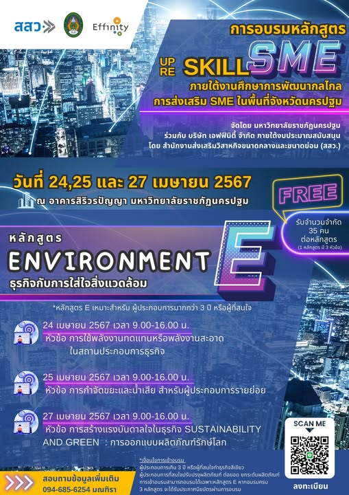 มหาวิทยาลัยราชภัฏนครปฐม โดย ความร่วมมือ กับ บริษัท เอฟฟินิตี้ จำกัด และได้รับการสนับสนุนงบประมาณจากสำนักงานส่งเสริมวิสาหกิจขนาดกลางและขนาดย่อม สสว. ได้จัด "การอบรมหลักสูตร UPSKILL RESKILL SME" ภายใต้งานศึกษาการพัฒนากลไกการส่งเสริม SME ในพื้นที่จังหวัดนครปฐม. หลักสูตรนี้มุ่งเน้นการ พัฒนาทักษะ (Skill Development) ให้กับผู้ประกอบการ SME (โดยเฉพาะผู้มีประสบการณ์มากกว่า 3 ปี) หรือผู้ที่สนใจ จำนวน 35 คน โดยไม่มีค่าใช้จ่าย ในด้านการดำเนินธุรกิจอย่างยั่งยืน โดยจัดขึ้น 3 วัน ครอบคลุมหัวข้อสำคัญดังนี้: